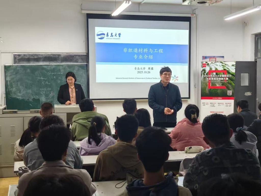 活动伊始,周蓉老师从多角度对专业进行了系统解读。首先,她概述了非织造材料与工程专业的核心定位,强调其在现代纺织、医疗防护及环保科技等领域的广泛应用前景;其次,介绍了专业教师团队的组成,包括资深教授和青年骨干教师的专业背景与研究专长;最后,聚焦学生就业,周老师结合实际案例分析了毕业生的就业去向,涵盖知名企业、科研机构及深造路径,鼓励新生树立职业目标。对于新生尽快构建完整的专业认知框架有很大帮助。
