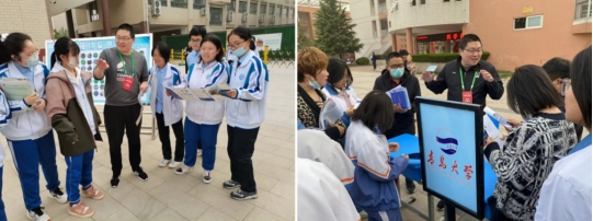 主动出击,赴济南、淄博、滨州、潍坊、烟台、威海、青岛等地区开展校园行活动,深入高中校园,将我校特色优质纺织类专业进行推介,为高中老师、家长、同学们进行认真、详细的介绍,并解答报考专业选择方面的疑问,受到广大考生及家长们的热烈欢迎,作为我校“名校高中行”系列活动之一,开辟了我校优势特色专业主动走进高中校园的招生新思路。